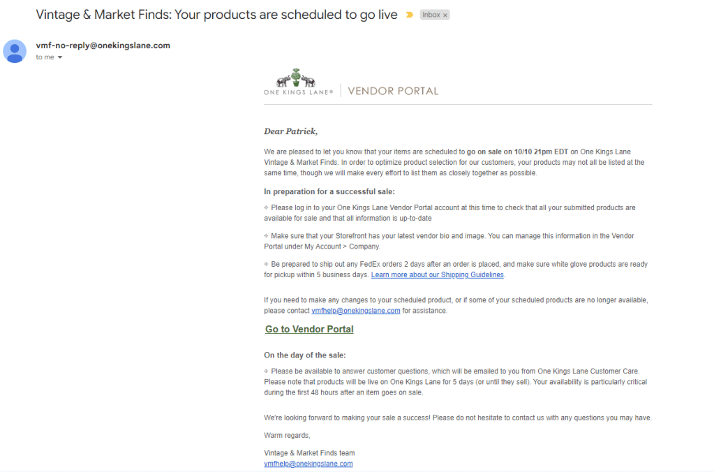 One of the early learnings during the VP development were recurring pain points reported from our vendors that they were not in control of listing their product and providing details on the product itself. Product listings were originally managed by our internal merchandising team picking and choosing which products would go on the site. Our team built a new LOB called Vintage + Market Finds or VMF, which provided the ability for vendors to self-serve and list products themselves within Vendor Portal. We built a series of emails that would be triggered based on the activity of submitted products.