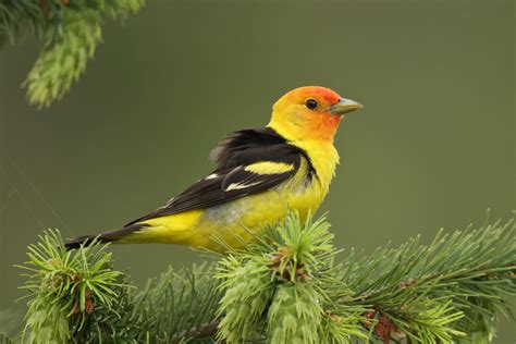 There you are, strolling along when suddenly a flash of color catches your eye. You pause, look up, and there it is – a vibrant Western Tanager perched on a nearby branch, its red head and yellow body standing out vividly against the green leaves.