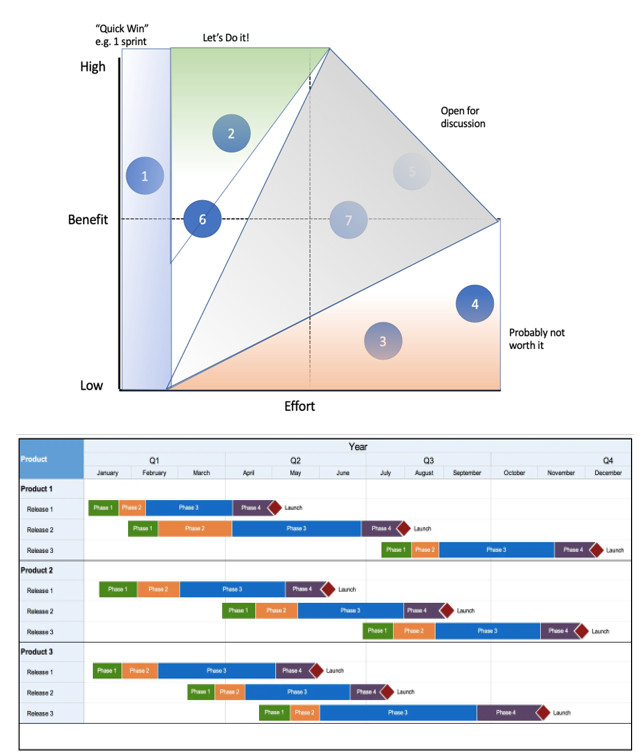 Discovery work ultimately lays the foundation for product roadmap and strategy. Of course, the next step is translating those learnings into long-term plans that communicate the current state, future vision, and tangible steps to get there. Simple templates like value vs. effort matrices can be highly effective for aligning stakeholders on what to work on first. The matrix is structured with “value” on the vertical axis and “effort” on the horizontal. This allows you to clearly identify the “quick wins” as well as the more complex, strategic bets that would require buy-in and coordination across the organization.