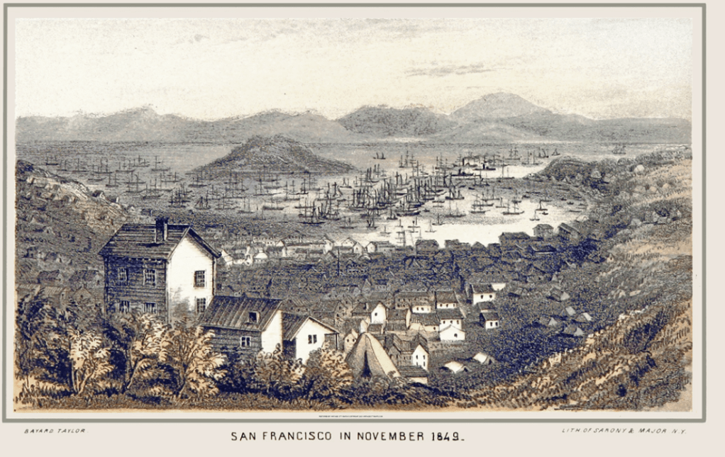 This mindfulness journey reminded me of how those early settlers adapted to the realities of Gold Rush life. San Francisco’s cost of living was high, even back then—eggs, for example, cost roughly $90 in today’s prices. I later learned that financial pressure then led the city to become a restaurant town, where communal dining was more affordable. In addition, downtown San Francisco, especially near the waterfront became a huge village of tents of many of the downtrodden.